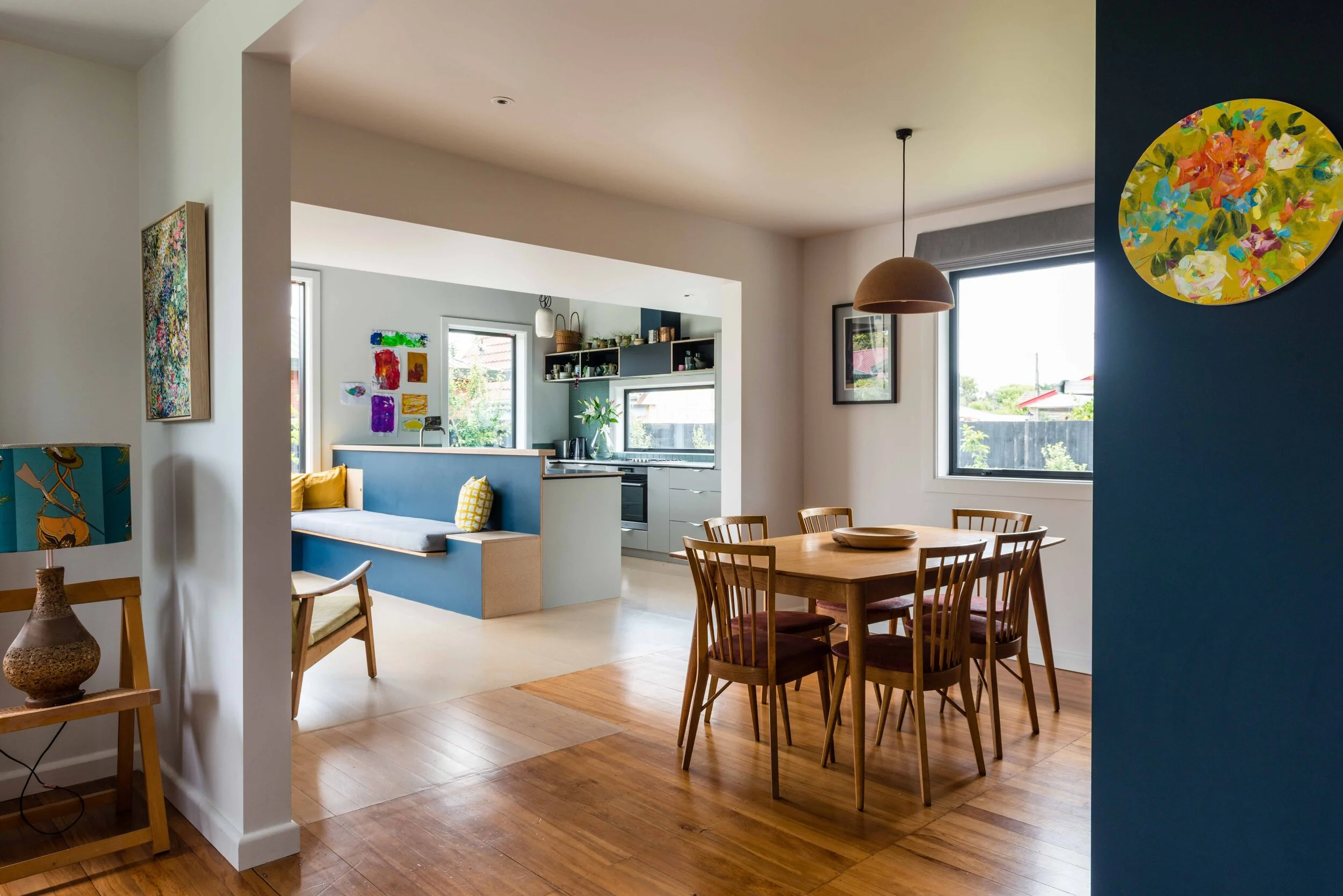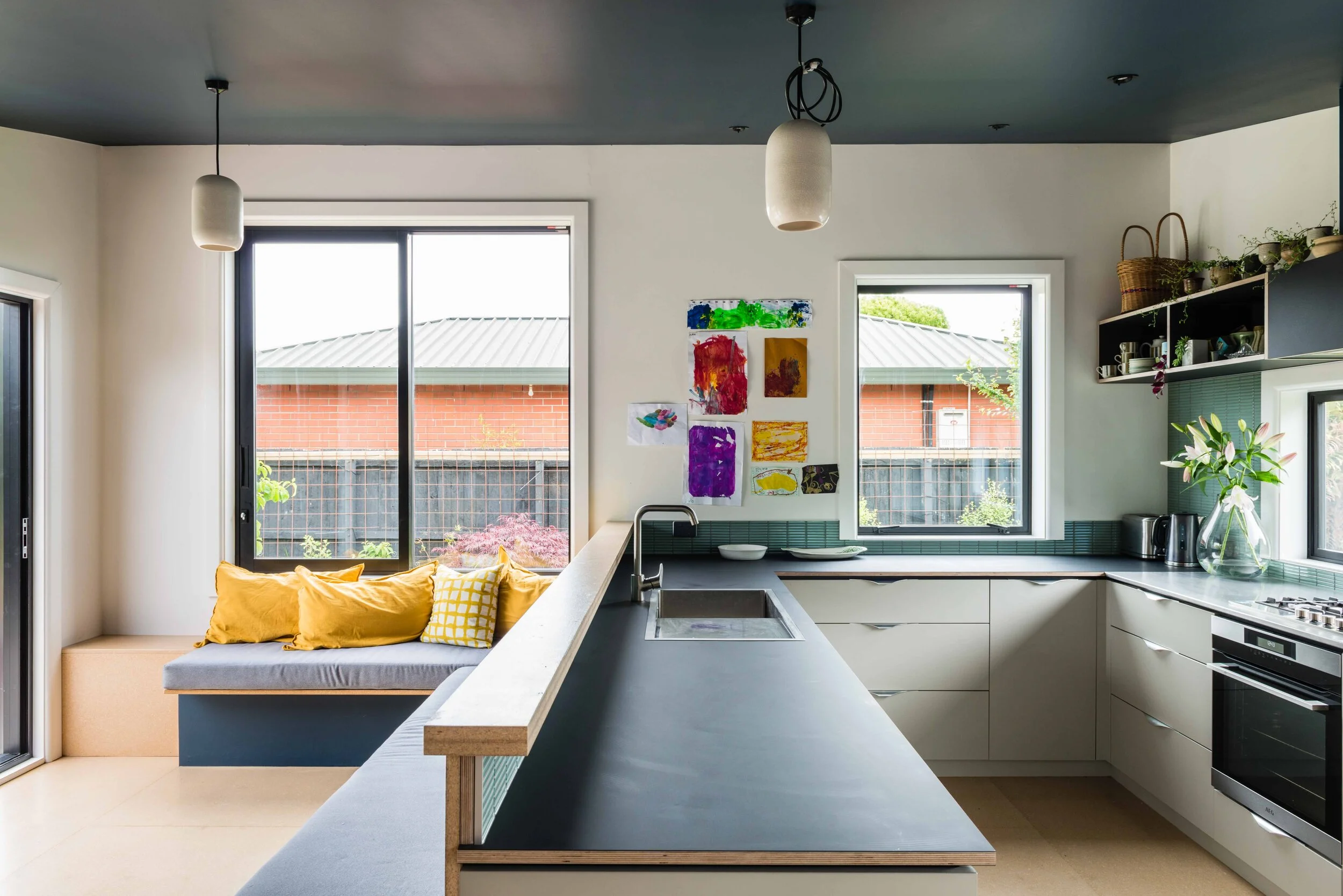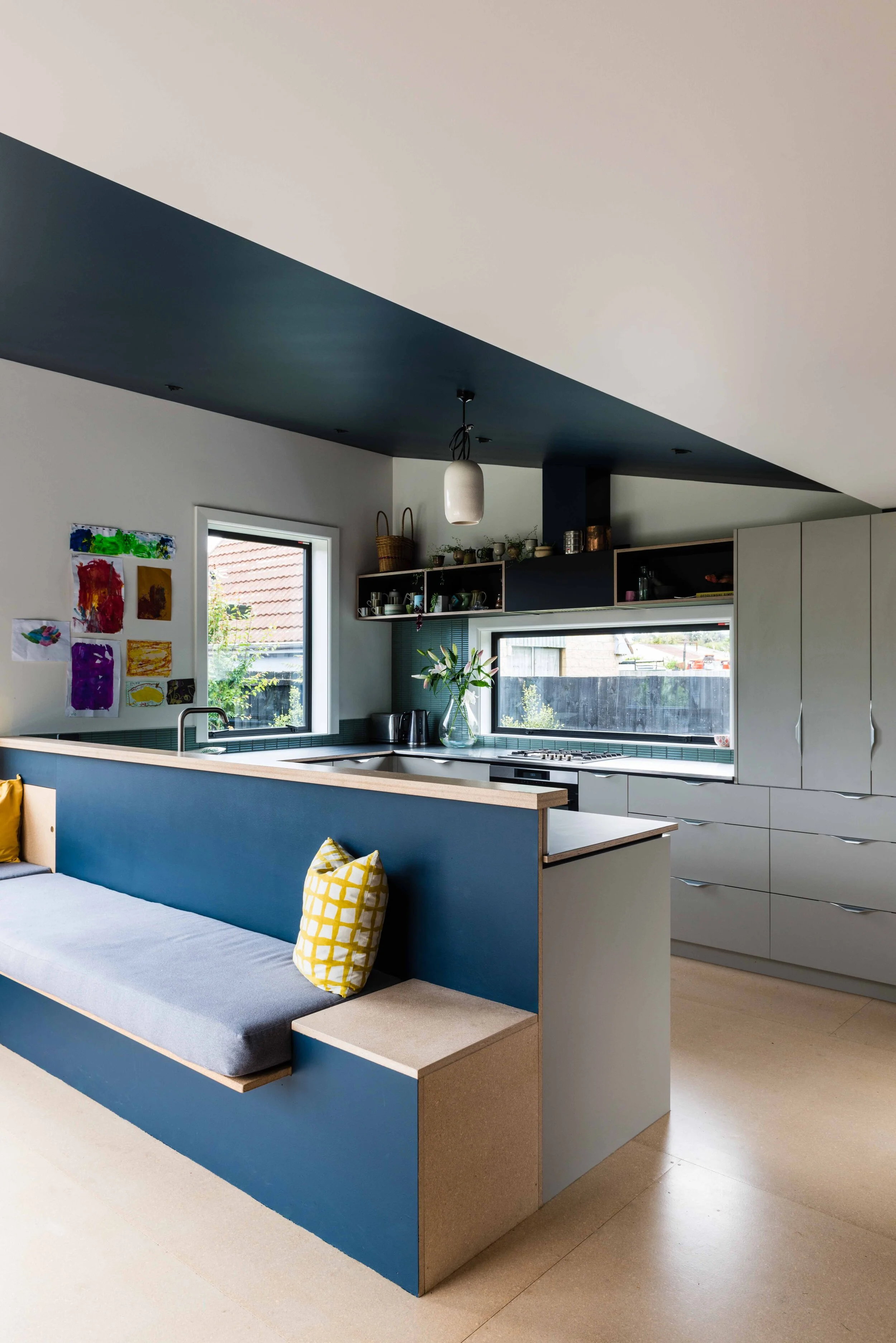 This 1950s bungalow, affectionately termed 'the gnome house' by the owners pre-extension, has been transformed to suit the needs of a growing family. A new kitchen and second living area create a functional, sociable space. Built-in seating not only provides a great spot to sit and chat but also doubles as storage.