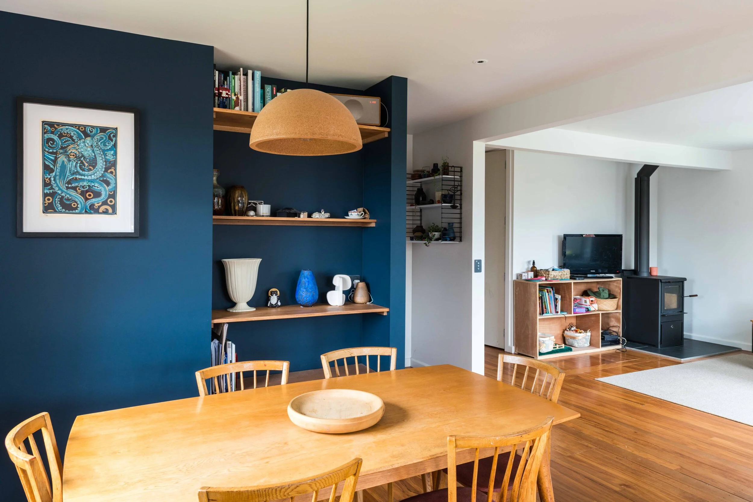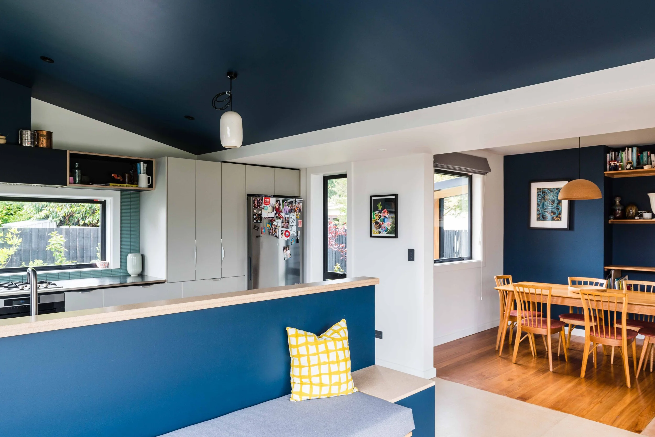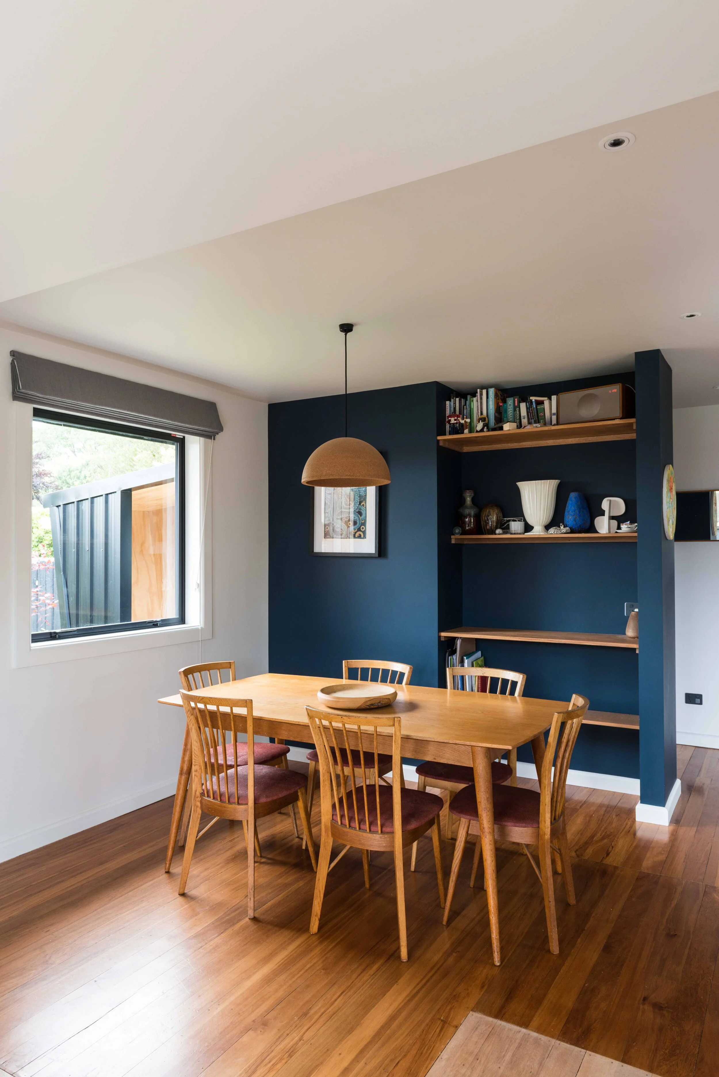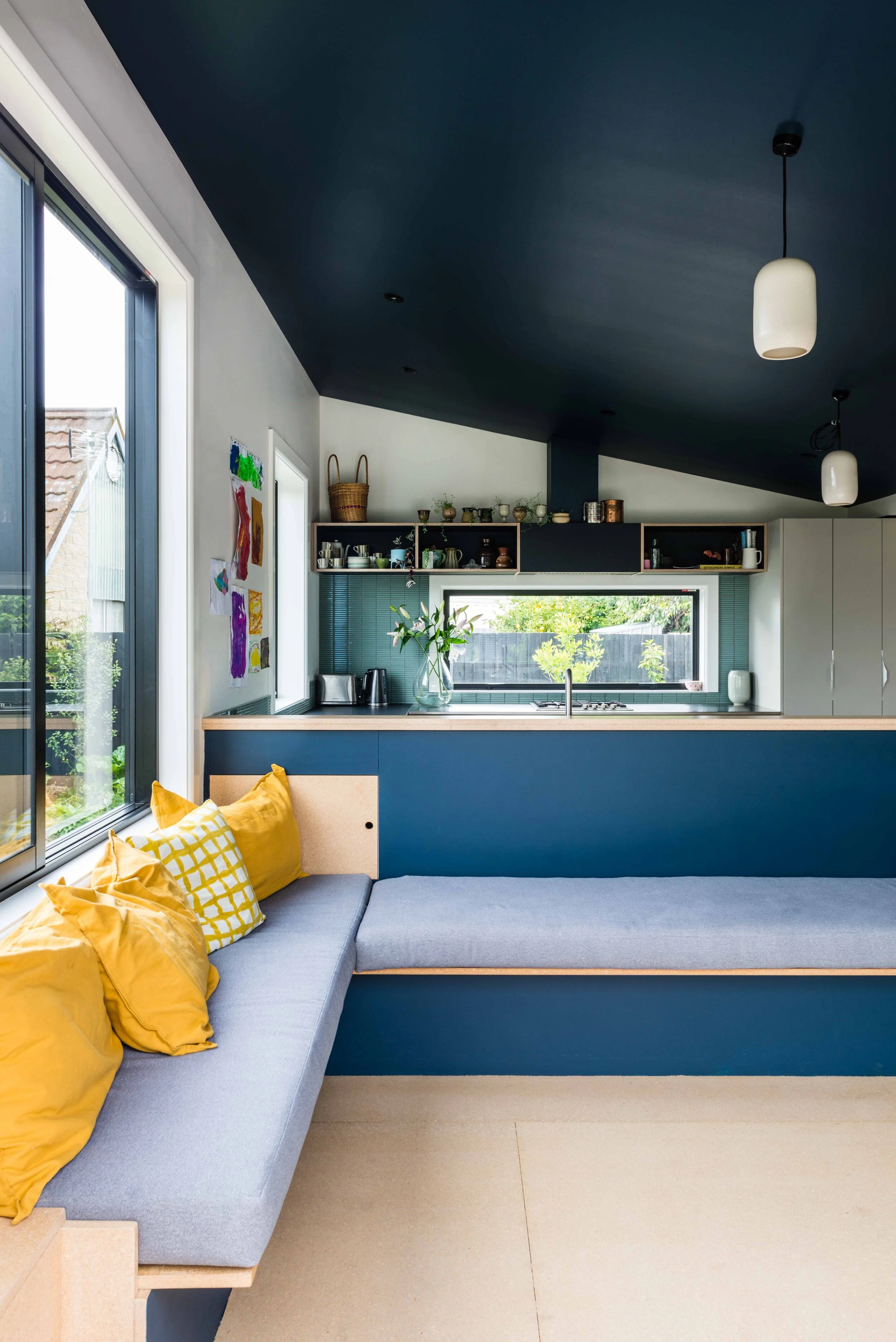 A dark blue ties the raked ceiling, seating and dining room wall together, while complimenting the warm timbers and mustards of the soft furnishings.