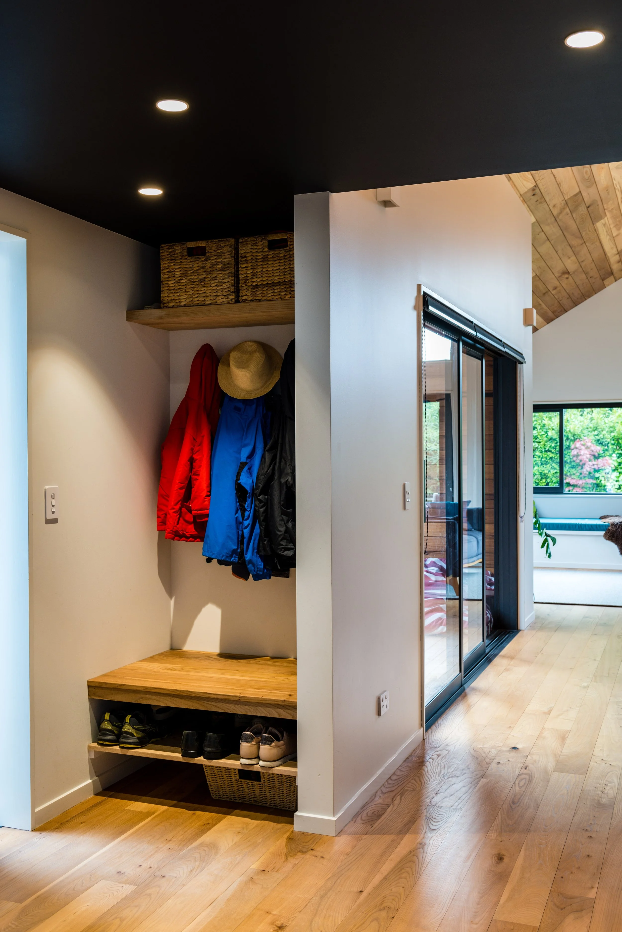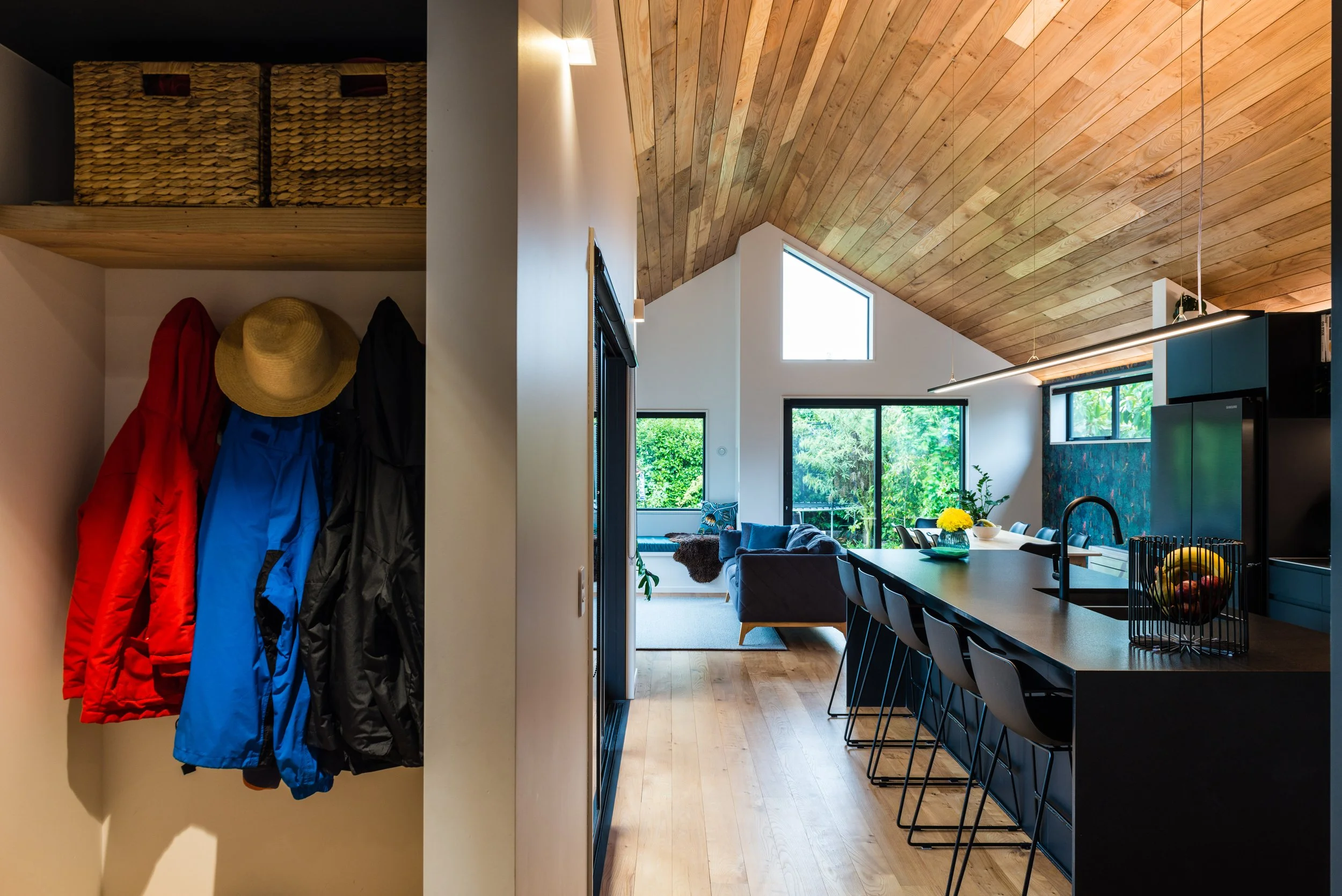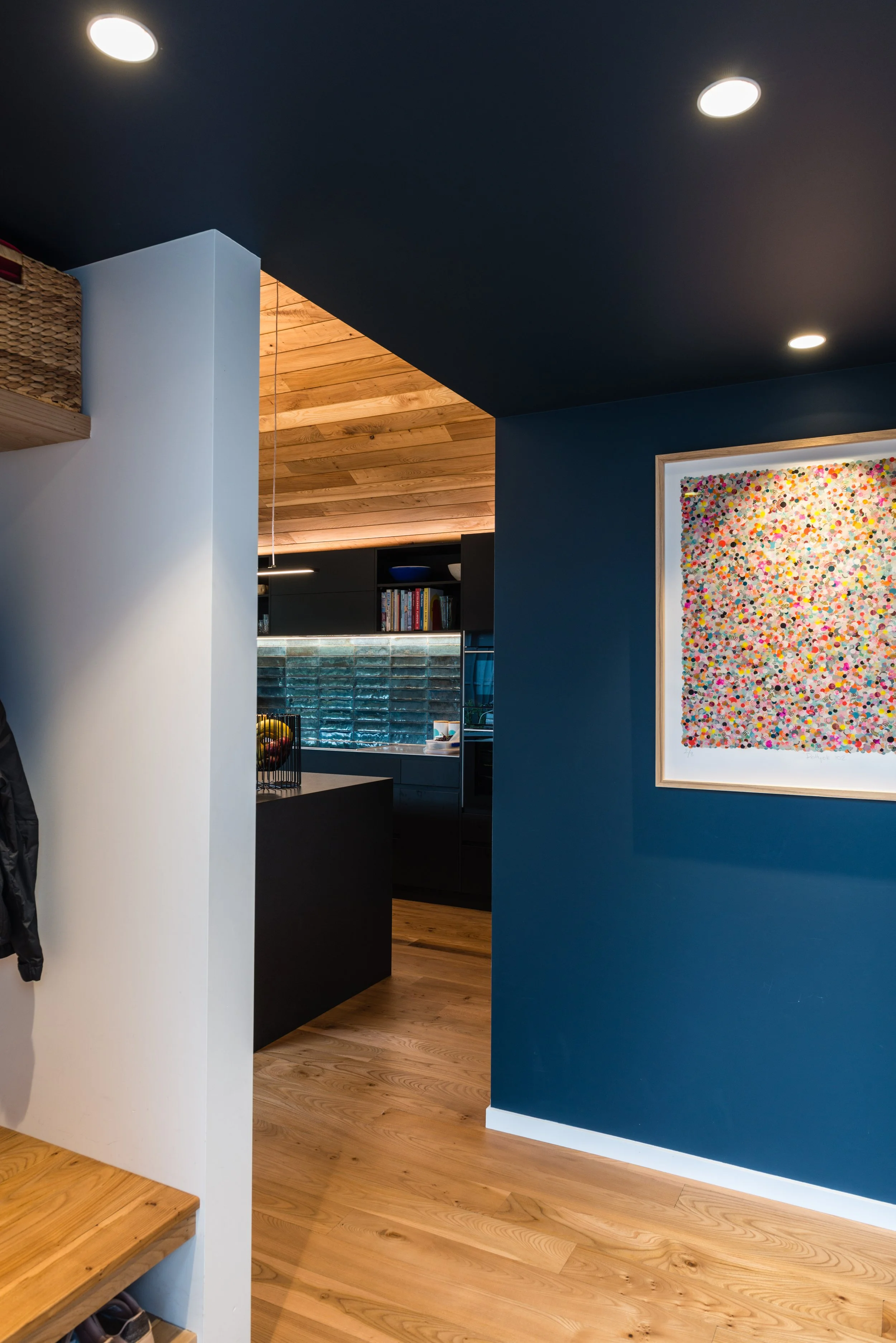 The lowered ceiling at the entrance allows the extension and the existing house to be connected and acts as a divider between the two very different spaces.